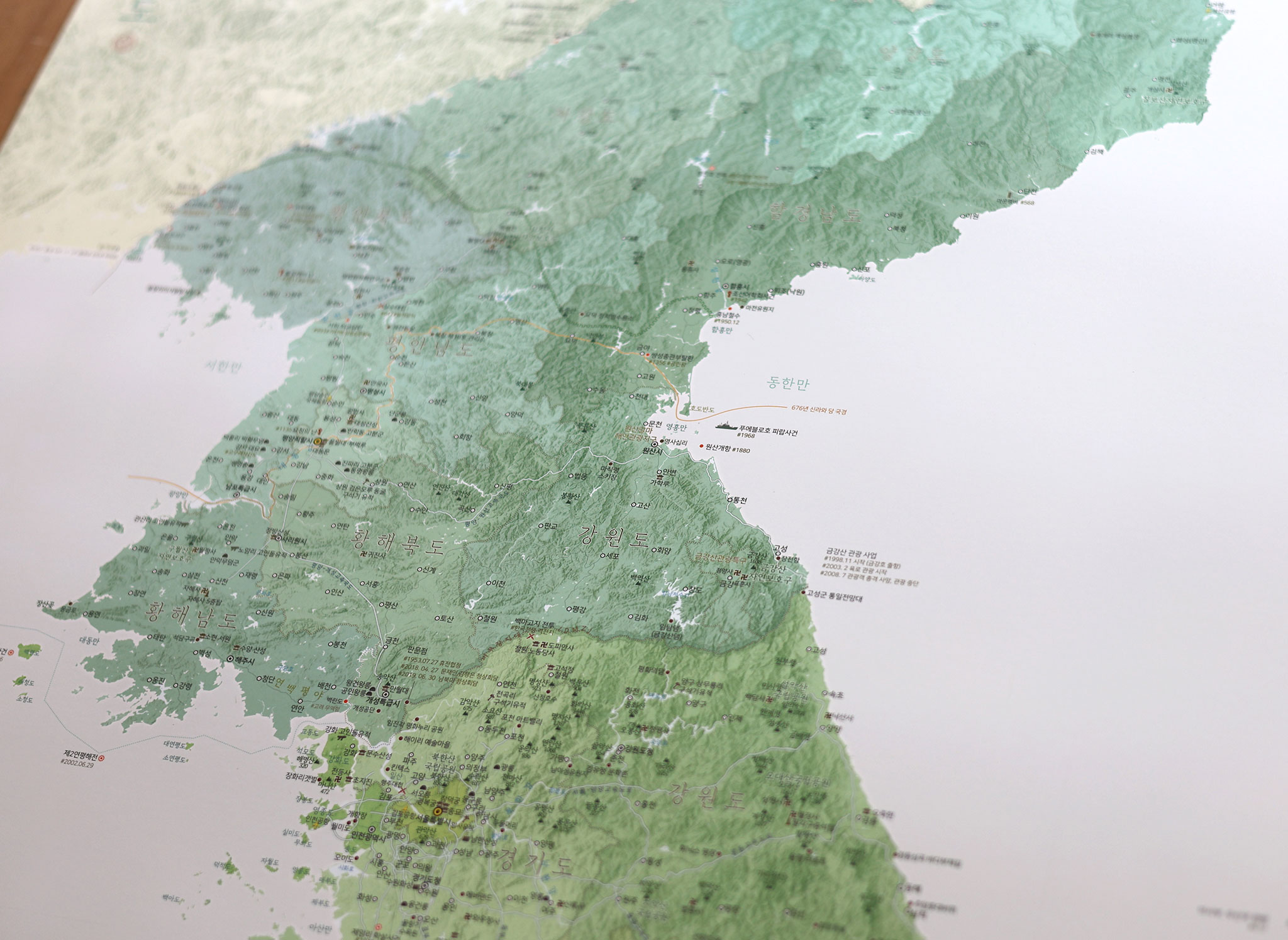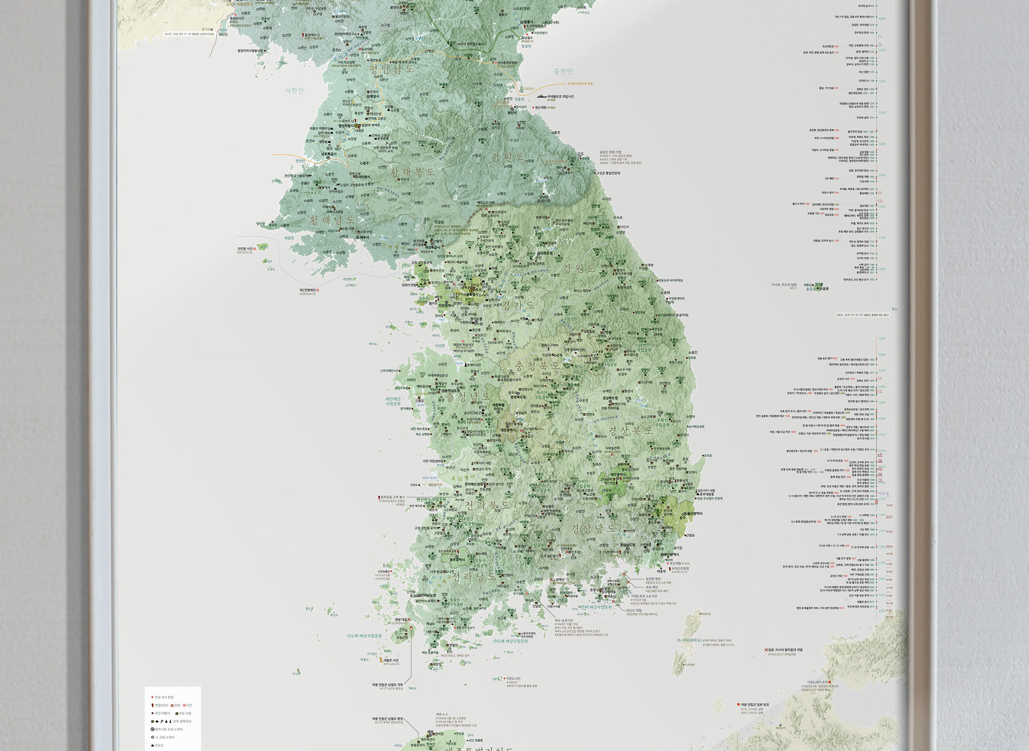 암기 위주의 학습으로는 한국사를 온전히 이해하기 어렵습니다. 모티브맵 “우리나라 가볼지도”는 지리와 역사를 입체적으로 연결해, 과거 사건의 현장을 한눈에 보여줍니다. 우측에는 수능 한국사 범위에 맞춰 유명 역사 선생님이 정리한 연표가 배치되어 있어 지도와 함께 흐름을 파악하며 공부할 수 있고, 지도 위에는 지형과 100대 명산을 포함한 주요 산맥이 음영으로 표현되어 한국 땅의 높낮이와 지리적 배경을 이해하는 데 도움을 줍니다.